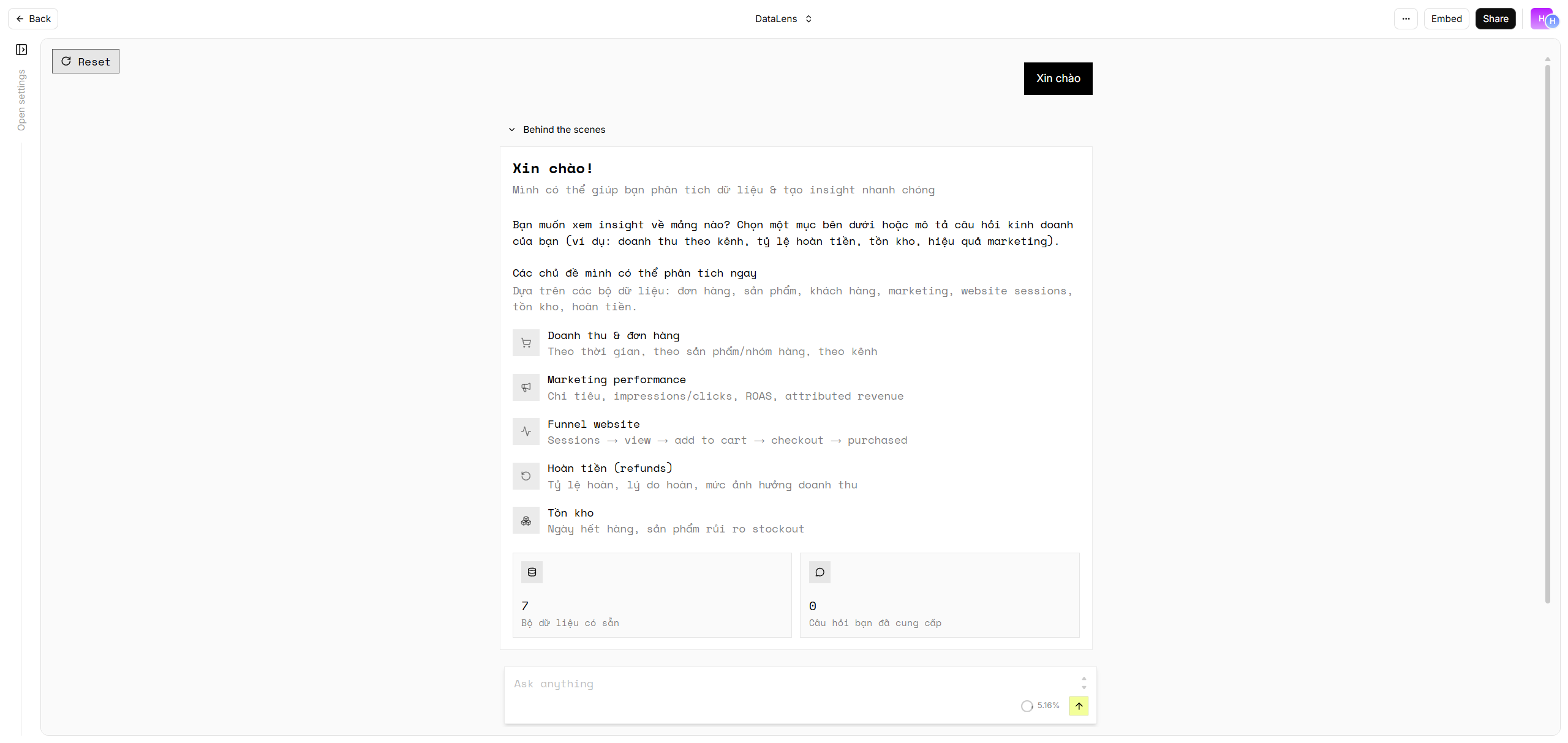 Bạn có thể xem thử tôi đang dùng 1 Agent Phân tích dữ liệu để hiểu rõ hơn ngụ ý trên của Anthropic. Nếu để ý kỹ thì con agent này đang tương tác với chúng ta qua Agent Interface.