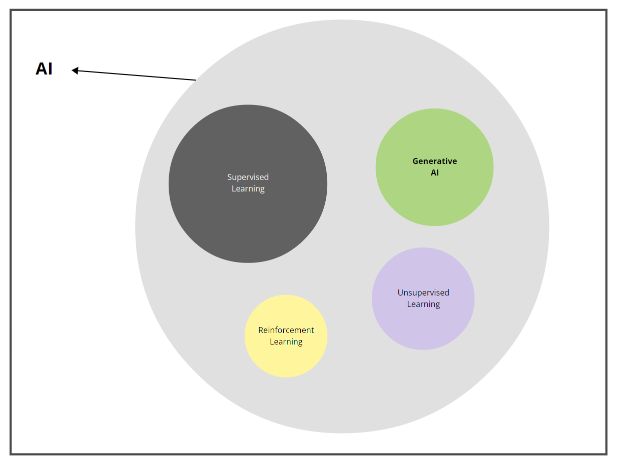 Các cách tiếp cận phổ biến nhất để giải quyết các vấn đề kinh doanh là supervised learning (học tập có giám sát) và generative AI (một số trang dịch là AI tạo sinh). Biểu đồ sau đây cho thấy mối quan hệ giữa các nhánh khác nhau của AI: