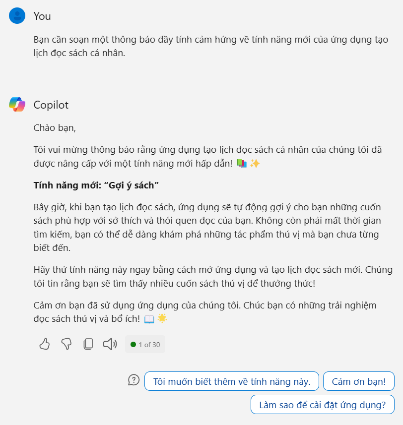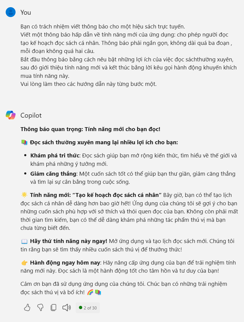 Sau đây tôi sẽ ví dụ 3 câu lệnh prompt với 3 cấu trúc khác nhau, sử dụng Copilot Generative AI