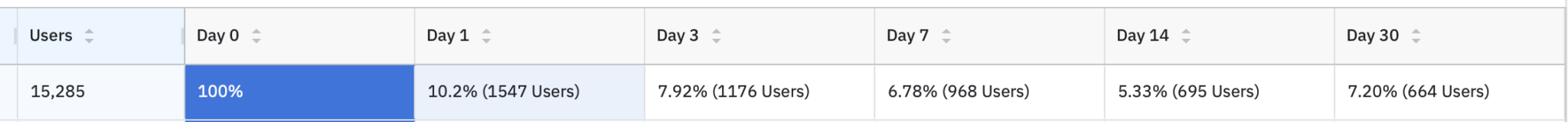 Như trên thì Day 0 là ngày 15.285 người dùng mới tham gia sản phẩm (tỷ lệ 100%).