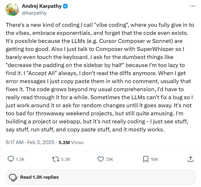 Vào ngày 3 tháng 2 năm 2025, Andrej Karpathy đã chia sẻ một dòng tweet về một kiểu lập trình mới mà ông đang khám phá, và ông gọi nó là vibe coding.